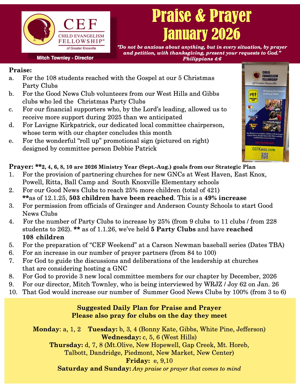CEF cannot function without prayer. We value your prayers for God’s grace, provision, wisdom, and direction, that we serve faithfully and to His glory. We also ask you to “pray earnestly to the Lord of the harvest to send out laborers into his harvest.If you would like to be a part of our prayer team to receive a monthly prayer letter, please email us at : info@cefknox.com with the subject: Prayer Team.